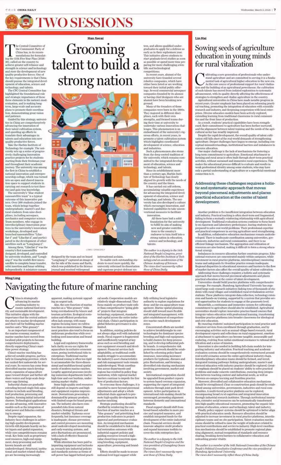3月11日,《中国日报》(China Daily)两会专版刊发全国人大代表、中国科学院院士、我校校长韩杰才署名文章《一流大学何以迈向前列、担起强国使命:一体推进教育科技人才发展》(Grooming talent to build a strong nation)。
