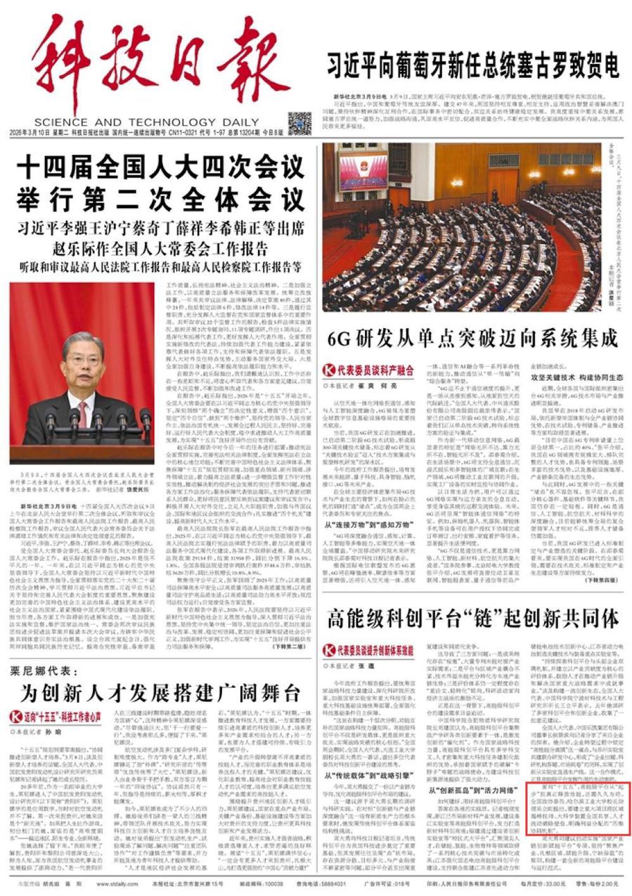3月10日,《科技日报》头版刊发《高能级科创平台“链”起创新共同体》,报道全国政协委员、我校校长助理吴立刚围绕今年政府工作报告谈提升创新体系效能。