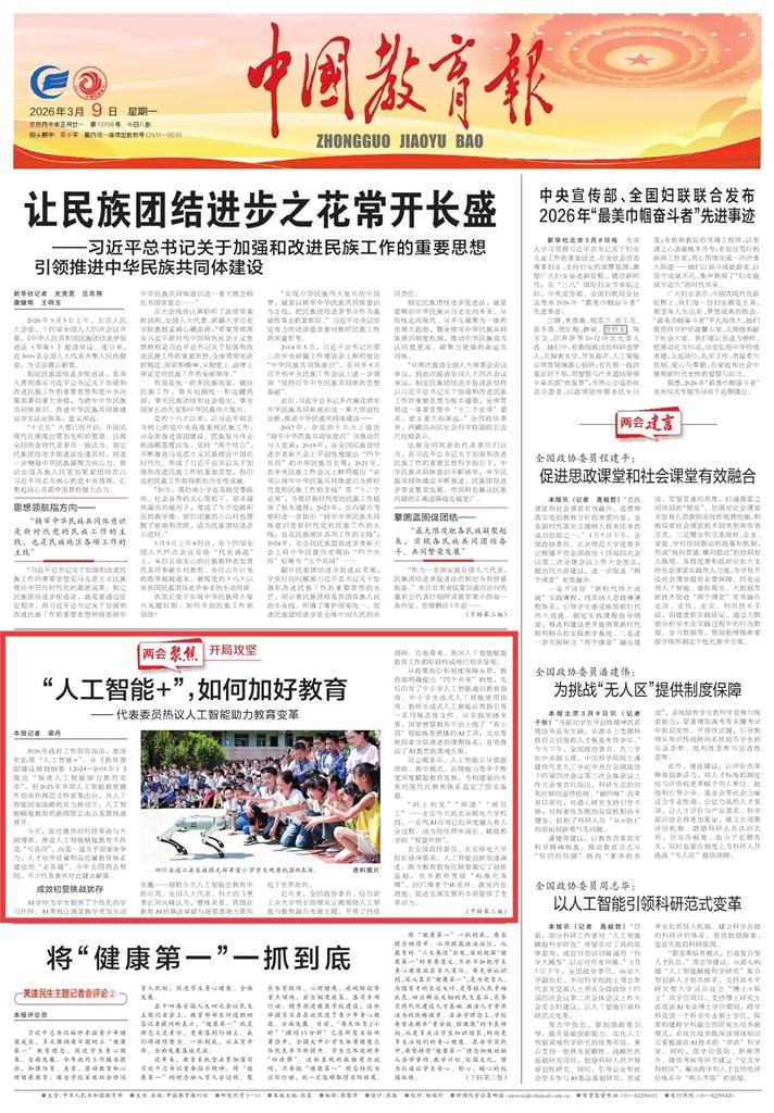 2026年政府工作报告指出,要深化拓展“人工智能+”。从《教育强国建设规划纲要(2024—2035年)》提出“促进人工智能助力教育变革”,到2025年多项人工智能教育操作指南和规范文件密集出台,在人工智能国家战略的有力推动下,人工智能赋能教育的新图景正由点及面快速展开。