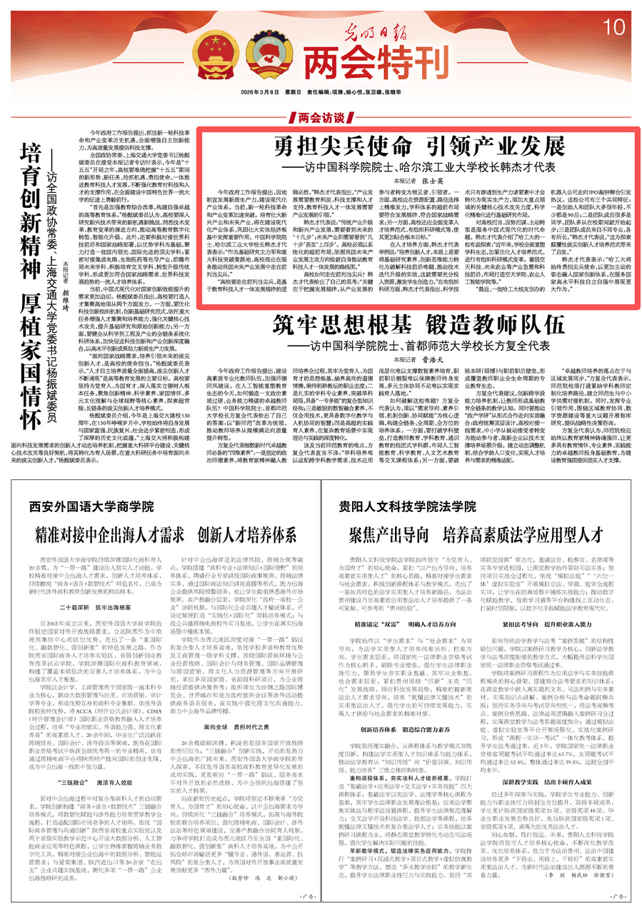 3月8日,《光明日报》两会特刊“两会访谈”栏目推出《勇担尖兵使命 引领产业发展——访中国科学院院士、哈尔滨工业大学校长韩杰才代表》,围绕今年政府工作报告提出的“因地制宜发展新质生产力,建设现代化产业体系”,访谈全国人大代表、中国科学院院士、我校校长韩杰才。