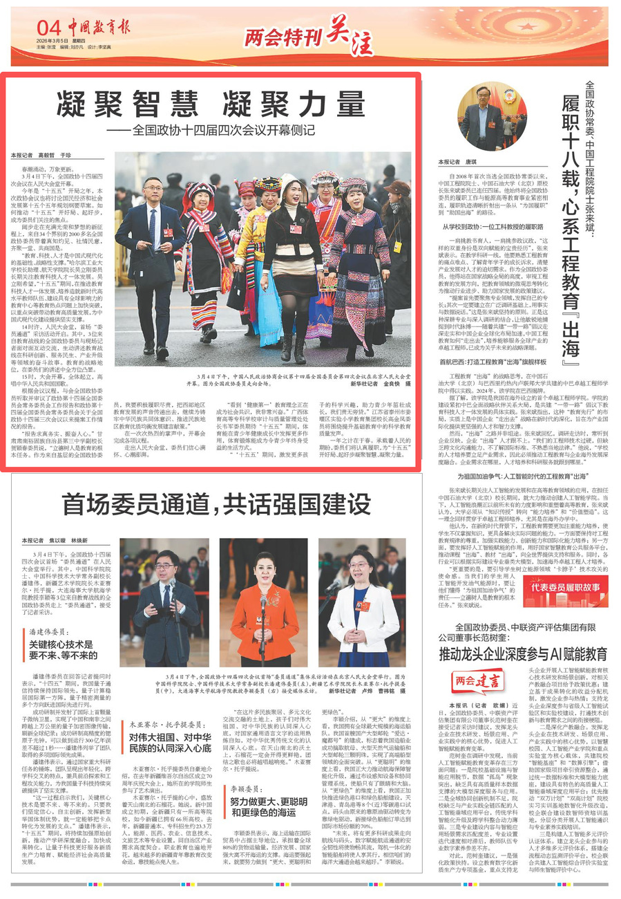 3月5日,《中国教育报》刊发《凝聚智慧 凝聚力量——全国政协十四届四次会议开幕侧记》,报道全国政协委员、我校校长助理吴立刚在全国两会上建真言、谋良策,以高质量议政建言成果服务和助力“十五五”开好局、起好步。