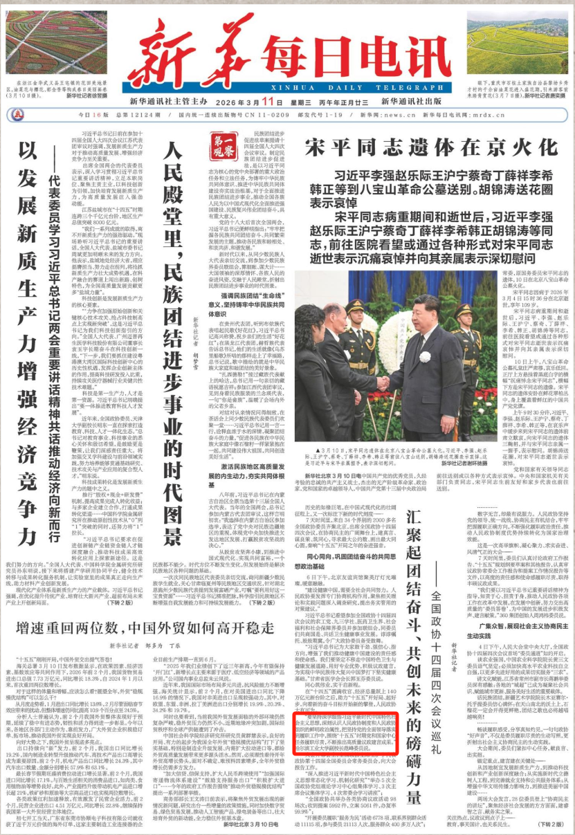 3月11日,《新华每日电讯》头版刊发《汇聚起团结奋斗、共创未来的磅礴力量——全国政协十四届四次会议巡礼》,报道全国政协委员、哈尔滨工业大学副校长范峰出席全国政协十四届四次会议,与来自34个界别的2000多名全国政协委员齐聚北京,在协商民主的广阔舞台上,建真言、谋良策、筑同心。