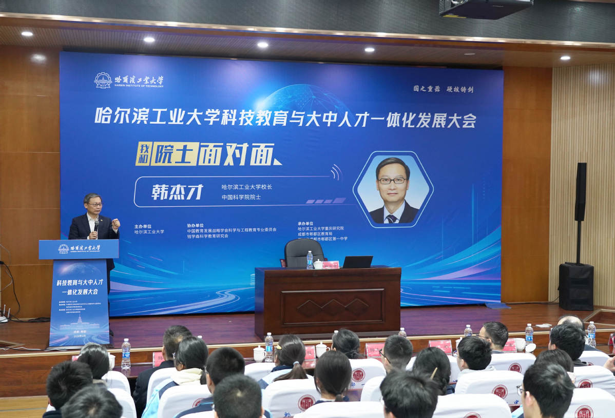 哈工大全媒体(商艳凯 叶楠/文 重庆研究院 本科生招办等/图)3月20日至21日,我校在四川成都举办科技教育与大中人才一体化发展大会。来自广西、重庆、四川、贵州、云南、西藏、陕西、青海、宁夏近150所重点中学的300余位校长、教师及成都市郫都区千余位教师代表,与来自高校、企业的专家学者共话工程科技教育与拔尖人才培养。校长韩杰才院士作大会报告并出席“我和院士面对面”等活动,大会期间带队走访成都市实验外国语学校、成都石室中学、成都树德中学、成都外国语学校、成都市郫都区第一中学校等重点中学,与师生代表就共同关注的话题深入座谈交流。