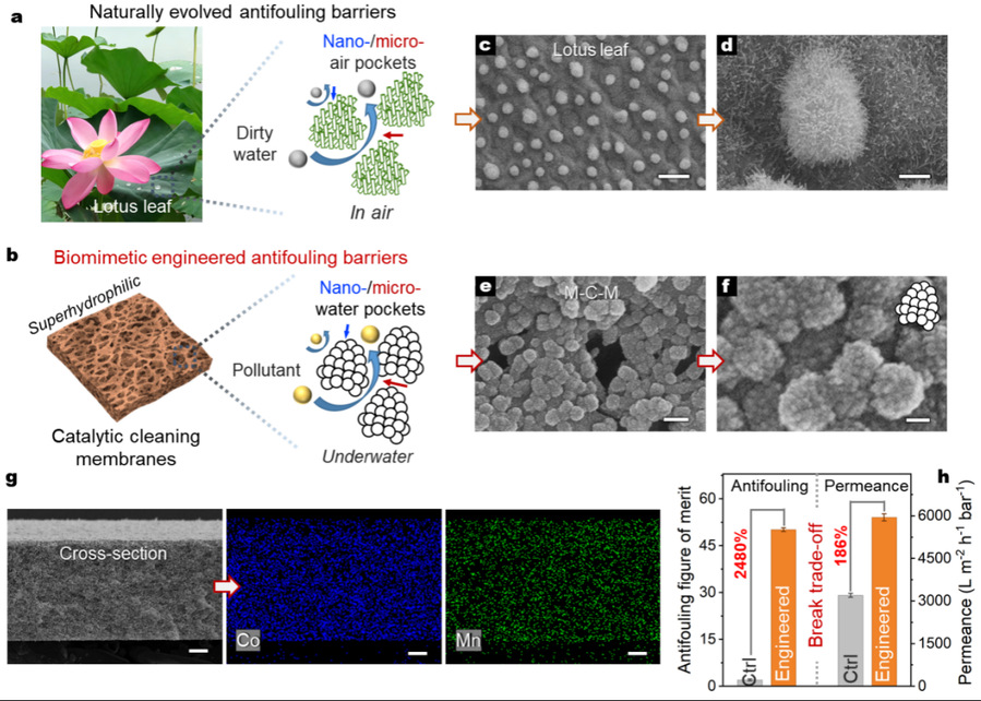仿生界面设计膜抗污屏障:(a、b)受荷叶启发,在聚合物膜上构建具有催化自清洁功能的界面抗污结构示意图;(c、d)荷叶表面扫描电镜照片;(e、f)经Co‑HHTP介导MnO₂矿化的膜(M‑C‑M)表面扫描电镜照片;(g)M‑C‑M膜截面的元素面分布图;(h)该膜在乳液分离中打破了抗污性能与渗透通量之间的权衡限制。