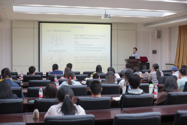 报告伊始,他首先介绍了Ames实验室的基本情况,并以幽默的语言讲述了刚进入实验室时发生的故事。报告中,他从分子磁体材料的合成、晶体结构和大分子合成时遇到的困难等几个方面,对报告内容进行详实的讲解。他重点介绍了分子磁体和磁性纳米材料、无机配体及配体控制水解反应中遇到的一些问题,并提出了这些问题的解决办法。在最后的交流中,他热情回答了在场师生提出的问题,并留下自己的电子邮件,欢迎有兴趣的同学与他联系。