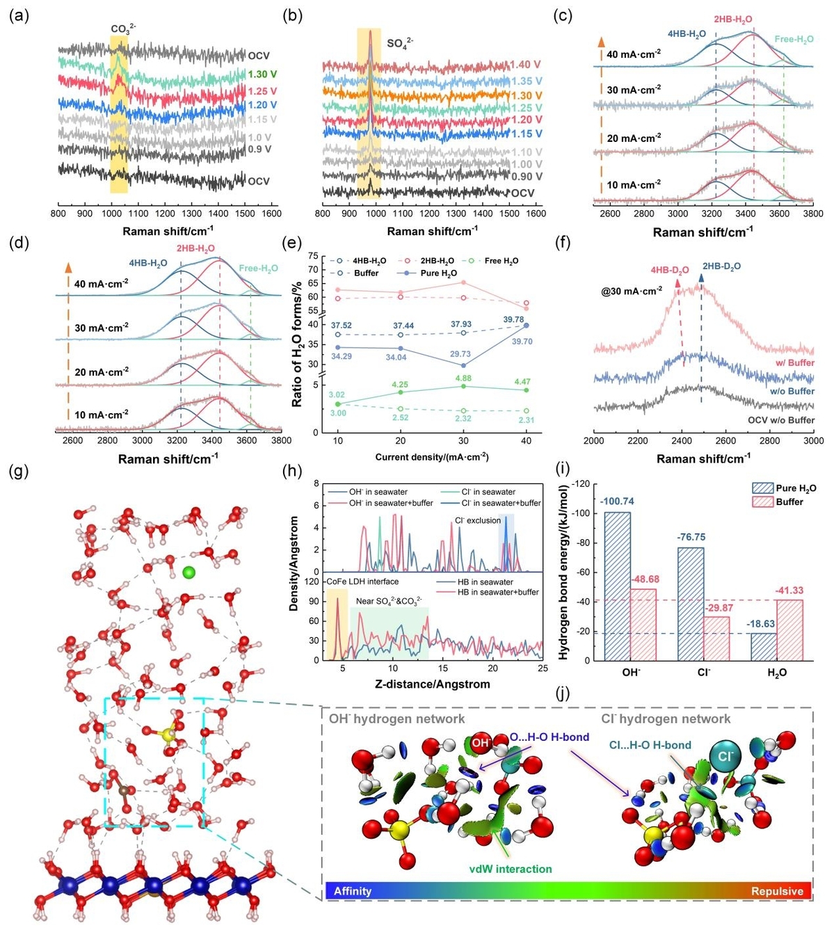 本研究通过结合AIMD模拟和原位拉曼光谱,证明含氧阴离子强化了阳极界面的氢键网络,在调控OH-选择性传质的同时,降低Cl-的氢键强度进而实现动力学排斥。基于此发现,通过SO42-/CO32-电解质工程设计了一种界面缓冲层:SO42-增强氢键网络刚性并实现Cl-排斥,而CO32-作为高效OH-泵来缓解高电流密度下的界面反应物消耗。这种协同作用使得常规催化材料CoFe LDH在阴离子交换膜电解槽中实现了高活性(1.808 V@300 mA·cm-2)和优异稳定性(550h@2.0 A·cm-2),对应制氢电耗为4.85 kWh·Nm-3(H2)。本研究所提出的氢键主导的离子筛分机制,解决了长期存在的实验现象与理论的冲突,为设计海水直接电解制氢催化剂及工艺路线提供了关键依据。