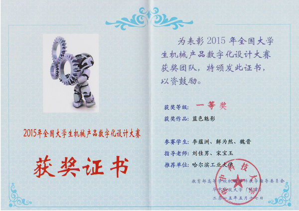 哈工大报讯(刘佳男 文/图)5月15日-17日,第五届全国大学生机械产品数字化设计大赛决赛在华中科技大学举行。由我校大一学生李蕴洲、解为然、魏晋共同完成的作品“蓝色魅影”(指导教师:刘佳男、宋宝玉)获一等奖。