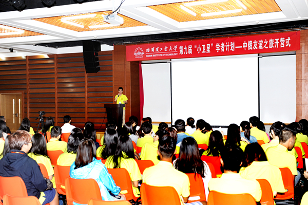 哈工大报讯(张全/文 冯健/图)6月11日上午,我校第九届“小卫星”学者计划交流营——中俄友谊之旅开营式在活动中心101举行。省教育厅副厅长尹晓岚出席开幕式并讲话。校长助理彭远奎为交流营学生代表授旗。开幕式由校港澳台办公室主任顾建政主持。来自我校和香港8所高校的190余名师生参加了开营式及首日活动。