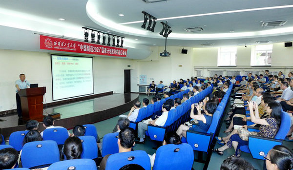 《中国制造2025》是我国实施制造强国战略第一个十年的行动纲领。校长助理刘宏结合当前国内外制造业发展的形势和需求,全面解读了《中国制造2025》的目标、主线、发展战略、重点领域等,并通过比较德国工业4.0的情况,就我校贯彻落实《中国制造2025》和启动制造业创新中心建设工程的具体问题作了分析。科工院常务副院长付强就《中国制造2025》中涉及的国家强基工程的规划论证工作作了说明。