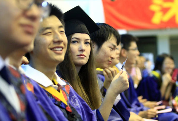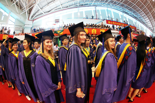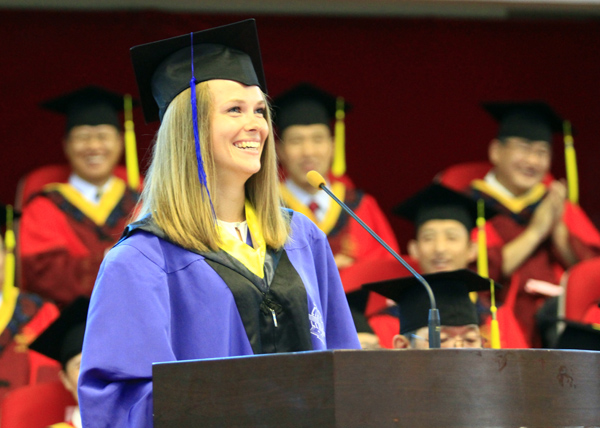 毕业留学生代表、俄罗斯的卡佳在发言中回顾了攻读硕士研究生期间温馨的点滴故事,并自豪地说:“我顺利拿到了硕士学位,感谢哈工大,您永远在我们心中!”
