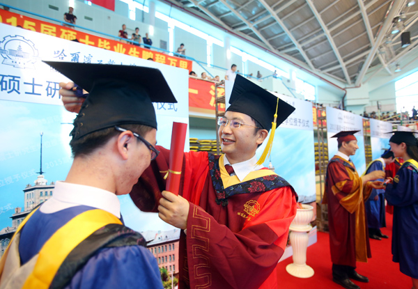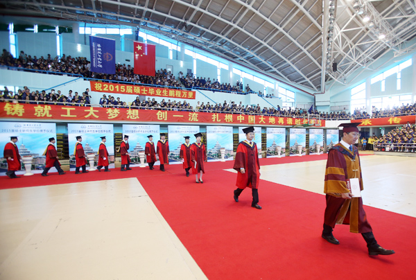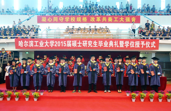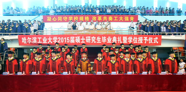 典礼由副校长丁雪梅主持。校党委常务副书记熊四皓、副校长郭斌,校长助理曹喜滨、甄良参加毕业典礼。熊四皓宣读了《哈尔滨工业大学关于表彰2015届优秀硕士研究生的决定》。165名硕士毕业研究生获得“优秀硕士研究生”(金奖)称号,175名硕士毕业研究生获得“优秀硕士研究生”(银奖)称号。与会领导为优秀硕士研究生代表颁发奖牌和证书。郭斌宣读了《哈尔滨工业大学学位委员会关于授予硕士学位的决定》,并向获得哲学、经济学、法学、文学、理学、工学、管理学等学位的3459名硕士毕业研究生表示祝贺。