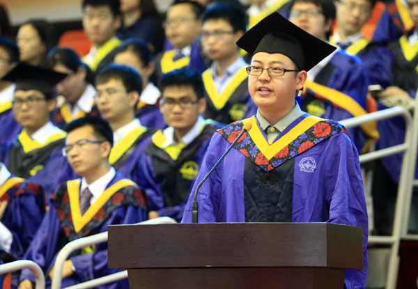 毕业生代表、电信学院李声勇在发言中分享了研究生期间为实现求学梦、支教梦、志愿者梦和军人梦所付出的努力和收获的喜悦,并表示要铭记责任,不辱重托,努力践行“规格严格,功夫到家”的哈工大精神,书写精彩的人生,奉献社会,回报母校。