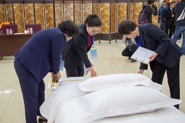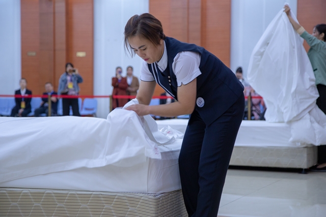 本次比赛以“弘扬工匠精神,展现后勤风采”为主题,共设置厨艺类、服务技能类、现场表演赛3大类,大锅菜、精品菜(热菜)、精品菜(冷拼)、面点、财务技能、中餐宴会摆台、会议服务、客房服务、最佳表演9个比赛项目,来自工业和信息化部机关及直属事业单位13支代表队132名选手参加了比赛。赛场上,选手精神抖擞,严谨认真,纷纷亮出自己的看家本领:冒着香气、外观漂亮的菜品摆满在展台上,形式各异、主题不同的宴会摆台大气简朴,意蕴深刻,琳琅满目、花样繁多的面点让人赏心悦目、味蕾大开……与会领导来到现场观摩比赛,评委们也严谨细致地逐一打分。