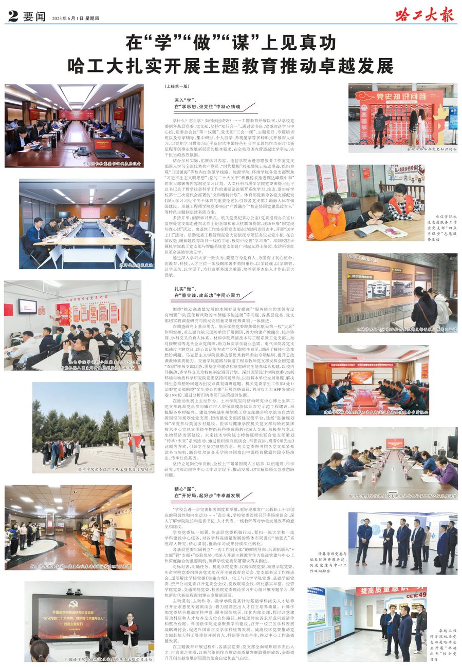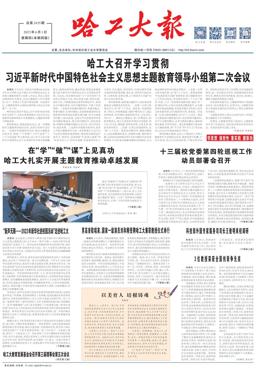 以党的二十大精神为遵循,立足教育、科技、人才一体部署,再次深学细悟习近平总书记致哈工大建校100周年贺信精神,更加深刻领悟到“打造了一大批国之重器”“培养了一大批杰出人才”“为党和人民作出了重要贡献”的高度肯定,既是对哈工大多年来在服务科教兴国战略、人才强国战略、创新驱动发展战略中不断发展壮大的规律揭示,也是对哈工大面向新时代新征程,发挥航天第一校“尖兵”作用、办好人民满意教育的科学指引。要贯彻落实好党的二十大作出的重大战略部署,就要跳出教育看教育、立足全局看教育、放眼长远看教育,以更强系统观念和战略思维,高位谋划中国特色、世界一流的新百年卓越之道。