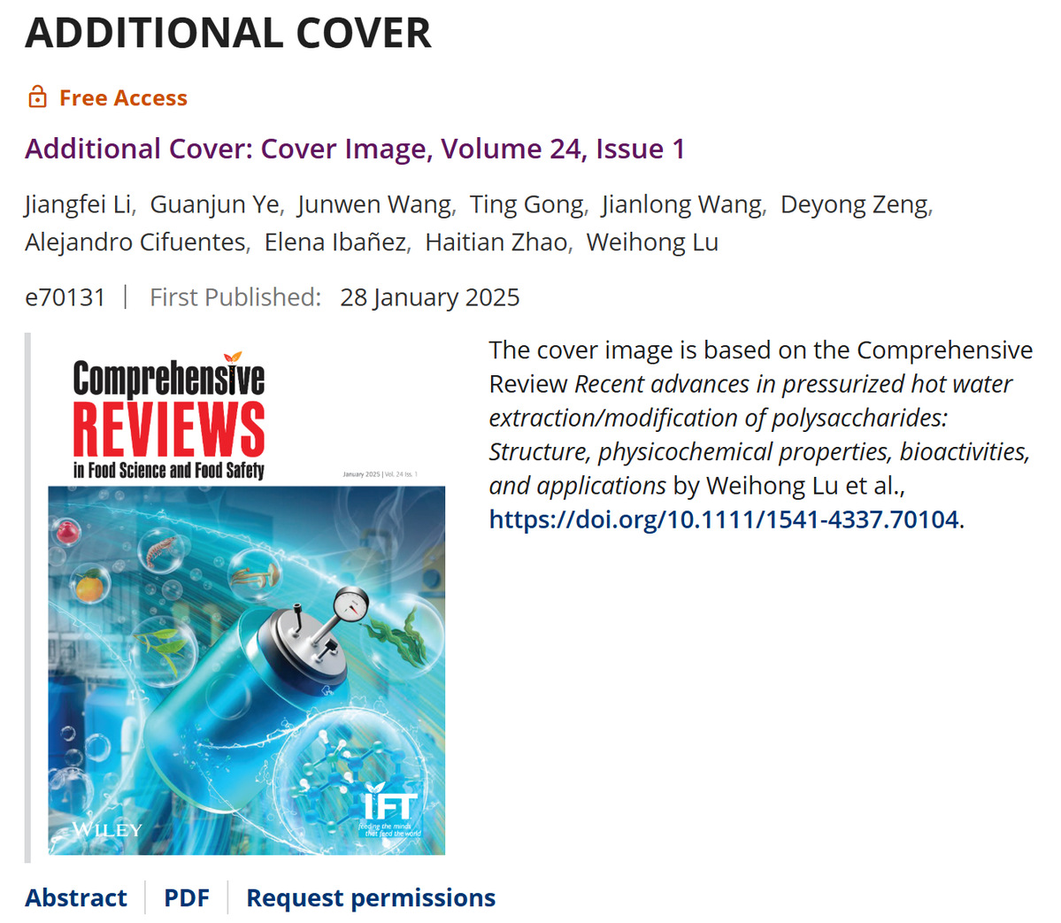 哈工大全媒体(刘培香 赵海田 李江飞/文 李江飞 于文辰/图)近日,我校生命科学和医学学部教授、极端环境营养分子合成转化与分离技术国家地方联合工程实验室主任卢卫红团队在食品多糖研究领域取得重要进展,综述文章《加压热水提取/改性多糖的最新进展:结构、理化性质、生物活性及应用》(Recent advances in pressurized hot water extraction/modification of polysaccharides: Structure, physicochemical properties, bioactivities, and applications)发表于国际期刊《食品科学与食品安全综合评论》(Comprehensive Reviews in Food Science and Food Safety),并被选为封面文章,实现了我校在该期刊零的突破;《膳食多糖在尿酸调节中的作用:管理高尿酸血症的机制和益处》(The role of dietary polysaccharides in uric acid regulation: Mechanisms and benefits in managing hyperuricemia)发表于国际期刊《食品科学与技术趋势》(Trends in Food Science & Technology),标志着我校在食品科学领域的国际影响力进一步提升。