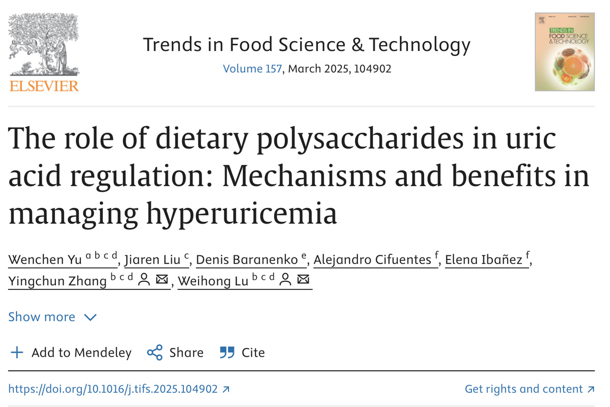 《膳食多糖在尿酸调节中的作用:管理高尿酸血症的机制和益处》一文深入探讨了高尿酸血症的发病机制、膳食多糖的代谢特征及其生理功能,并系统梳理了膳食多糖在降低尿酸水平方面的潜在分子机制,为膳食多糖作为一种天然、安全、有效的高尿酸血症预防和管理补充剂提供了重要理论依据。哈工大与哈工大郑州研究院为论文通讯单位,生命科学和医学学部卢卫红教授与张英春副教授为论文通讯作者,博士研究生于文辰为第一作者。