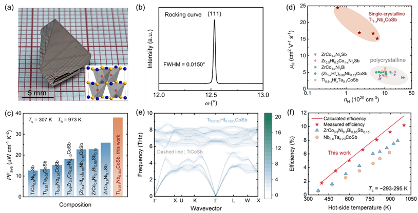 图1 TiCoSb基半哈斯勒单晶。(a)制备得到TiCoSb单晶光学照片,插图中是半哈斯勒的晶体结构。(b)TiCoSb单晶的X射线衍射摇摆曲线。(c)TiCoSb基单晶与XCoSb(X = Zr, Ti, Hf)基多晶材料的电子迁移率对比。(d)不同n型半哈斯勒材料的平均功率因子对比。(e)Hf合金化前后计算得到的声子谱结果对比。(f)单晶Ti0.76Nb0.03Ta0.05Hf0.19CoSb单腿器件的发电效率随热端温度的变化关系。