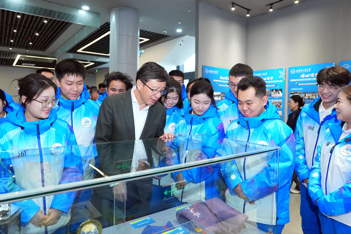 最后,陈杰与师生共同参观了哈工大“同心同梦”亚冬会主题展览,了解哈工大体育运动文化的百年掠影和为本届亚冬会贡献的哈工大力量。