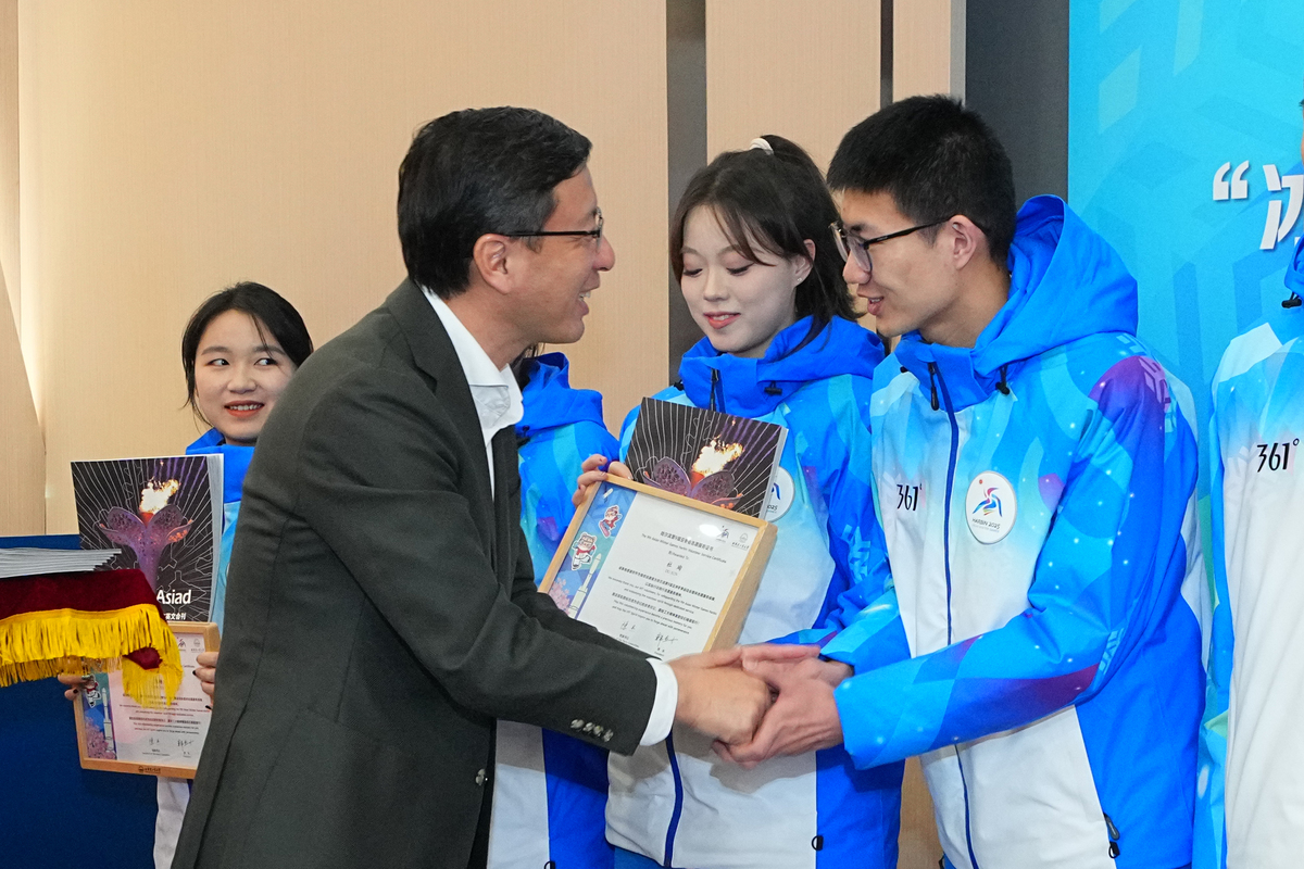 陈杰为亚冬会志愿者代表、亚冬会志愿者管理保障服务代表颁发了志愿服务证书和亚冬会官方定制英文会刊,会刊的封底处特别印制了学校专属标识,为志愿者们的亚冬记忆增添一份美好和独特。