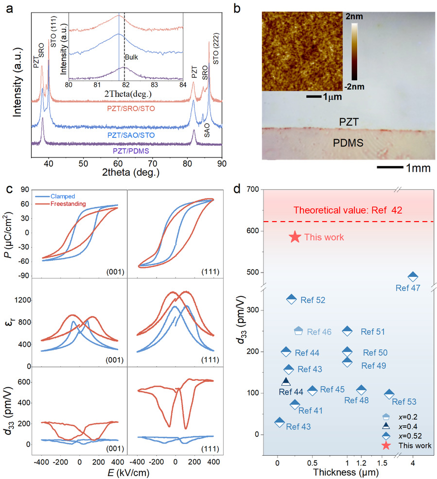 刚性与自支撑锆钛酸铅薄膜电学性能比较,自支撑薄膜获得了压电性提升