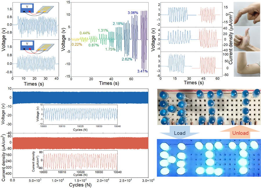 针对上述问题,团队利用晶体取向调控和水刻蚀牺牲层技术解除衬底应力,在(111)取向的自支撑锆钛酸铅(PbZr0.52Ti0.48O3)单晶薄膜中获得了585皮米每伏(pm/V)的高压电系数,并通过畴壁动力学分析和同步辐射、高分辨透射电镜等技术揭示了自支撑薄膜中高压电性的物理机制。此外,使用兼备高压电性和高柔性的(111)取向的自支撑锆钛酸铅(PbZr0.52Ti0.48O3)单晶薄膜制备的柔性压电能量收集器能够在超过3.4%的大应变下实现输出,经60000次的循环后保持输出稳定,其输出电压可达12伏特(V),输出功率密度达到创纪录的63.5毫瓦每立方厘米(mW/cm3)。采集到的电能经整流存储后,可以直接用于商用电子设备供电,标志着自支撑单晶薄膜技术向实用化迈出关键一步。