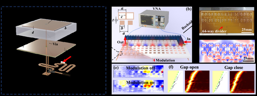 针对这一技术难题,团队首次在实验上精准操控时间调制下二维超表面界面表面波传输及其色散关系中带隙闭合现象,通过理论建模、电磁场仿真以及实验测量相结合的方式,创新性地提出利用超表面结构模拟时空光子晶体中表面波传输的方法。该研究设计了加载变容二极管的时空超表面结构,通过改变外加直流偏置电压以及时间调制参数,可以实现表面波的本征频率偏移,调控超表面阻抗,从而使表面波色散关系中混合带隙发生闭合,导致了界面上表面波的传输跳变。团队提出的时空超表面带隙闭合机制,为超快开关设计和短脉冲发生等应用提供了实验平台。