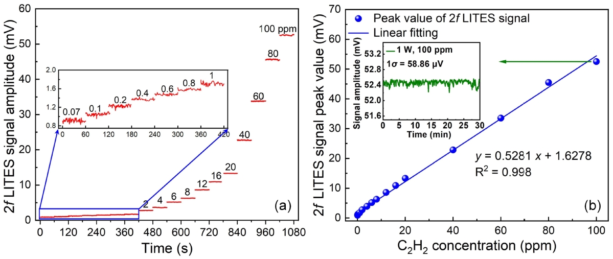 基于镀膜T型音叉的C2H2-LITES传感性能测试: (a)不同C2H2浓度下2f信号峰值;(b)浓度线性响应