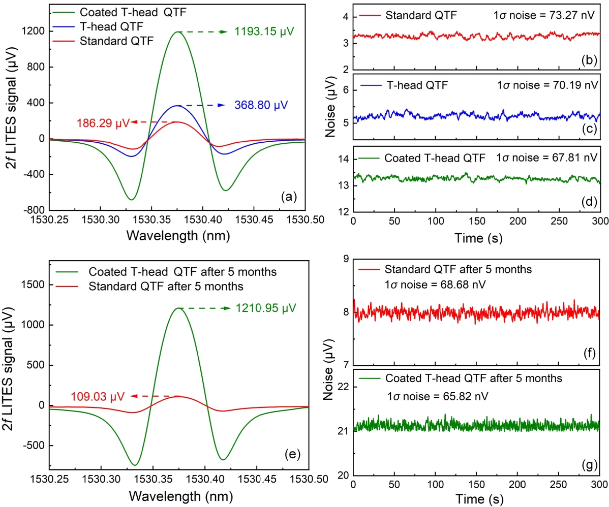 镀膜T型音叉性能提升效果:(a)标准音叉、T型音叉和镀膜T型音叉的2f信号对比;(b)-(d)三者的噪声;(e)5个月后标准音叉和镀膜T型音叉的2f信号对比;(f)(g)5个月后标准音叉和镀膜T型音叉的噪声