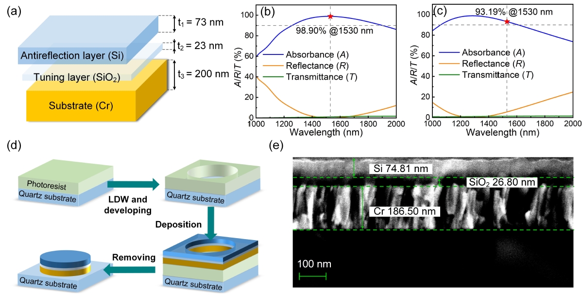 镀膜结构的制备与表征:(a)三层膜结构示意图;(b)镀膜反射率、吸收率和透过率的理论值;(c)镀膜反射率、吸收率和透过率的实测值;(d)镀膜流程示意图;(e)SEM截面图