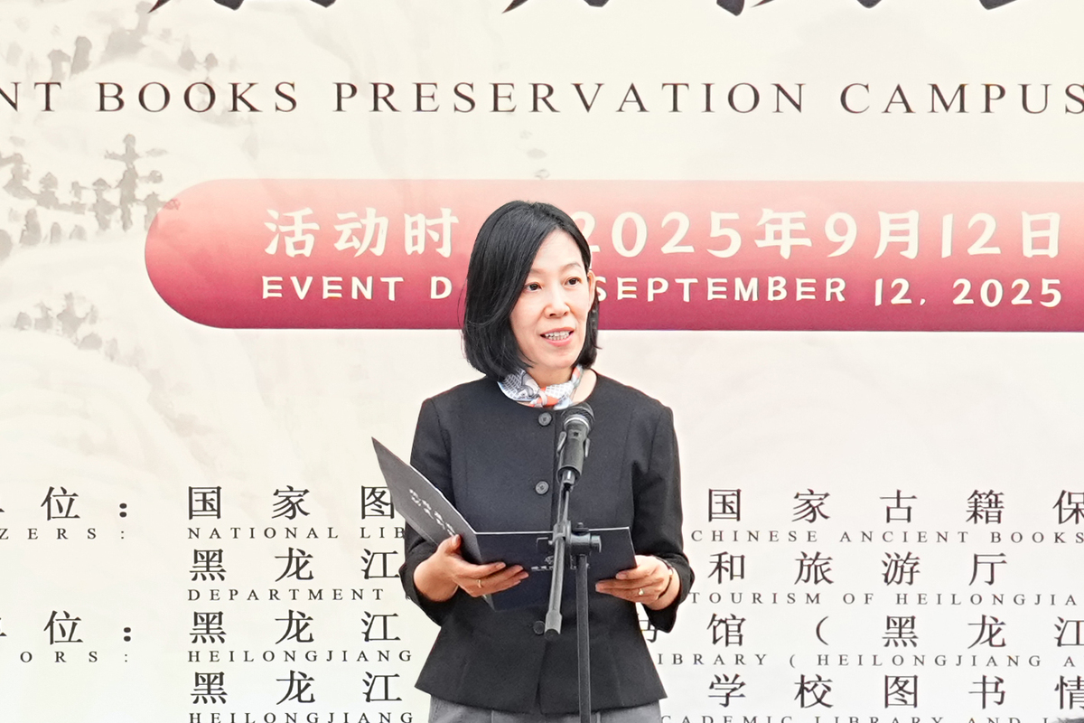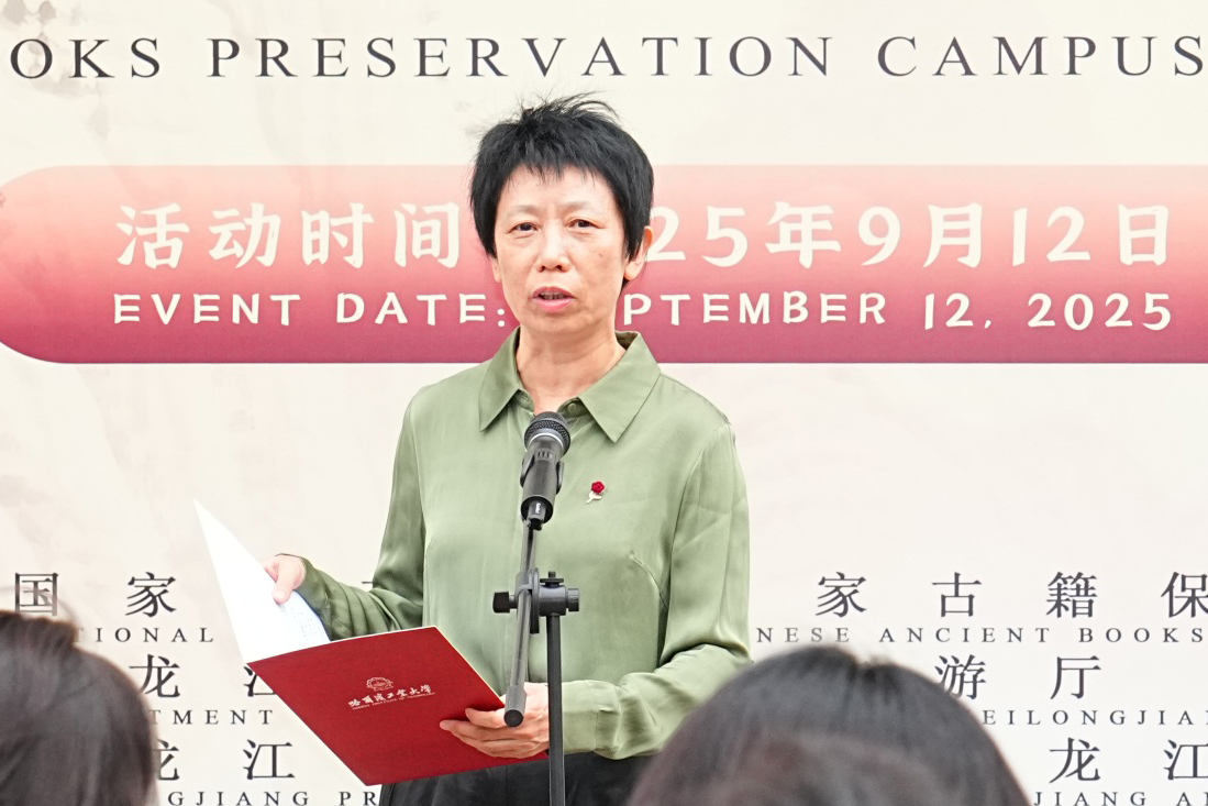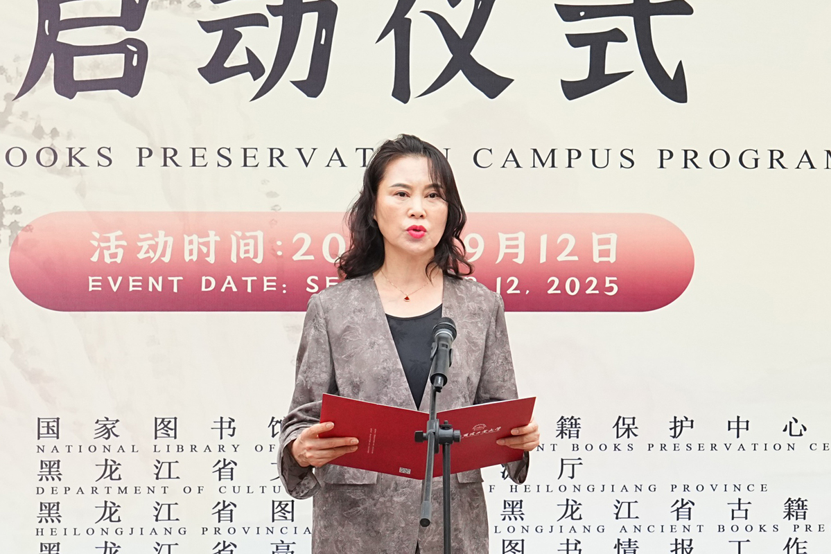 哈工大全媒体(阚思邈/文 辛然/图)9月12日,“古籍保护课程进校园”黑龙江站系列活动在校举行。国家古籍保护中心办公室副主任萨仁高娃,黑龙江省文化和旅游厅二级巡视员李玲,校党委副书记、副校长陈蕊出席启动仪式并致辞。黑龙江省图书馆党委书记、馆长刘梦杰主持启动仪式。