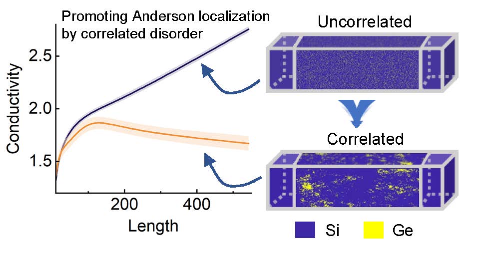 针对这一难题,易红亮教授团队基于非平衡格林函数(NEGF)方法系统研究了SiGe合金纳米线中具有长程关联无序的原子分布对声子热输运的影响。研究发现,当Ge原子的空间分布呈现长程相关特征时,低于2 THz的低频声子热输运受到显著抑制,进而使得体系热导率降低高达60%,突破了传统瑞利散射定律(Rayleigh law)对低频声子散射的限制,在理论上突破性实现了点缺陷系统中低频声子的安德森局域化。进一步分析表明,强相关无序结构不仅使0.6-1.2 THz范围内的声子从扩散输运转变为局域态,还使0.6 THz以下的弹道声子发生扩散转变。这种由空间关联性诱导的局域化现象,使纳米线的热导率随长度增加先升高后降低,出现了明显的峰值,这是安德森局域化的典型特征。研究指出,通过调控合金中原子分布的空间关联性,可在低维系统中实现对声子热输运的有效调控,为未来SiGe等热电材料优化与纳米热管理提供了新的设计策略。
