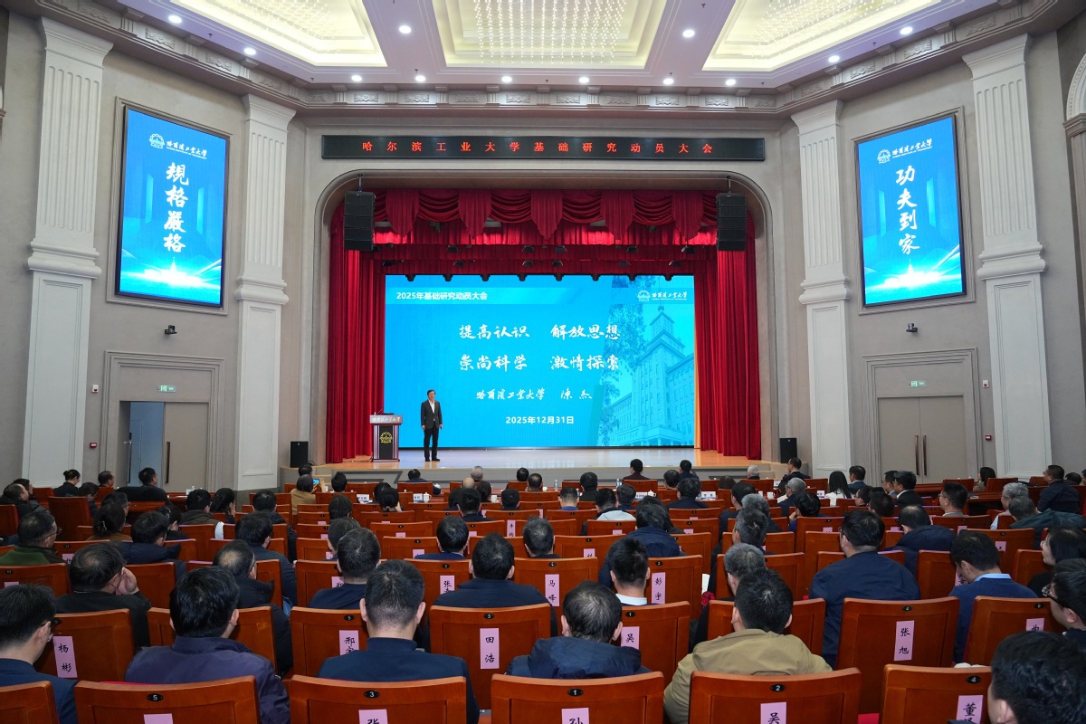 哈工大全媒体(刘培香/文 辛然/图)为深入学习贯彻习近平总书记关于基础研究的系列重要讲话重要指示批示精神,进一步凝聚共识、激发动能,推动基础研究实现高质量、体系化发展,以高质量基础研究加快迈向世界一流大学前列,12月31日,学校召开2025年度基础研究动员大会,系统总结过去一年基础研究工作取得的成绩,深入分析当前面临的形势与挑战,全面部署新阶段的目标与任务。校党委书记陈杰出席会议并作题为《提高认识 解放思想 崇尚科学 激情探索》的讲话,校长韩杰才作大会报告,常务副校长孙雪主持会议。全体在校校领导,赵连城、谭久彬、冷劲松、梅洪元、李惠、苑世剑等在校院士和全校干部、人才代表及师生代表等2000余人参加会议。