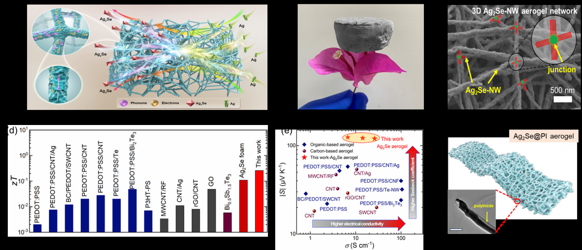 Ag2Se纳米线气凝胶的制备及性能优化:(a)Ag2Se纳米线气凝胶的制备流程示意图;(b)超轻Ag2Se纳米线气凝胶照片;(c)Ag2Se纳米线气凝胶的SEM形貌图。与文献报道的有机基和碳基气凝胶热电材料对比:(d)室温zT值柱状图;(e)Ag2Se纳米线气凝胶的塞贝克系数绝对值(|S|)与室温电导率(σ)关系;(f)Ag2Se@PI纳米线气凝胶的示意图。插图为透射电子显微镜图(标尺50纳米)。