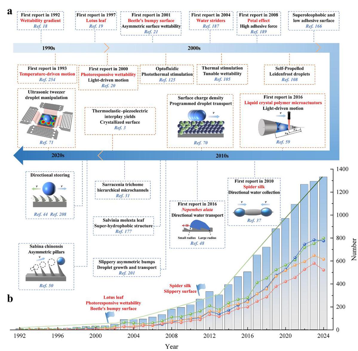 哈工大全媒体(张又元 谢明铸/文 谢明铸/图)近日,我校能源科学与工程学院帅永教授、王兆龙教授团队携手我校讲席教授、香港理工大学王钻开教授,对仿生结构毫流控的最新研究进展及其在多个前沿领域的应用前景进行了系统性总结,深入阐述了仿生结构设计原理、液滴被动与主动操控机制,以及该技术在雾水收集、热管理、生物医学等领域的广泛应用,为下一代智能流体操控系统与功能器件的开发提供了重要理论指导与实践参考。相关成果以《仿生结构毫流体:综述》(Bionic Structured Milli-fluidics: A Review)为题发表在《化学评论》(Chemical Reviews)上。