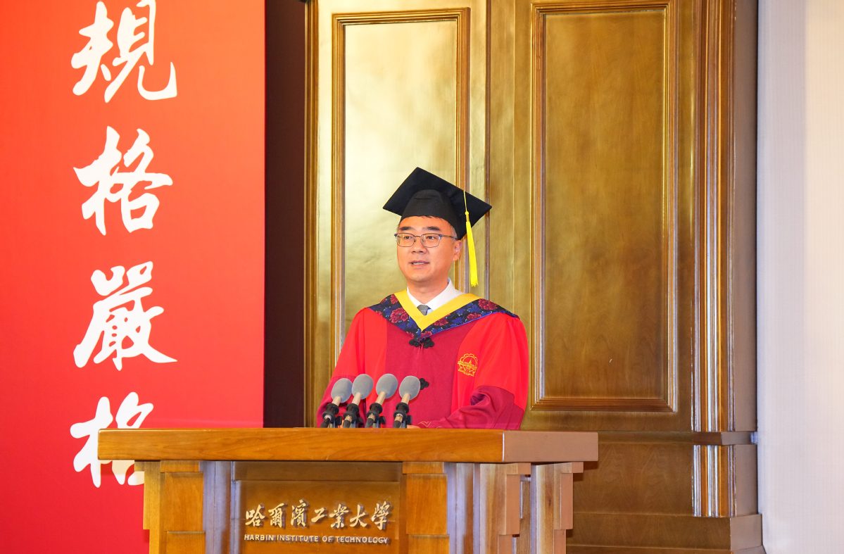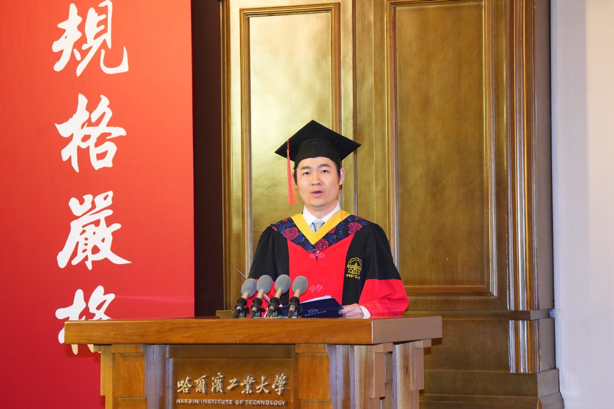 “一所大学的精神,是深刻在师生骨子里的文化基因……同学们,你们是新时代哈工大‘尖兵’文化涵养的优秀代表,奔赴未来必将成为推动强国建设的中坚力量。”机电工程学院赵京东教授作为导师代表寄语毕业生,要厚植底色,以哈工大精神立身致远;守正创新,以实干笃行成就远大事业;涵养智慧,以从容之心绘就圆满人生。