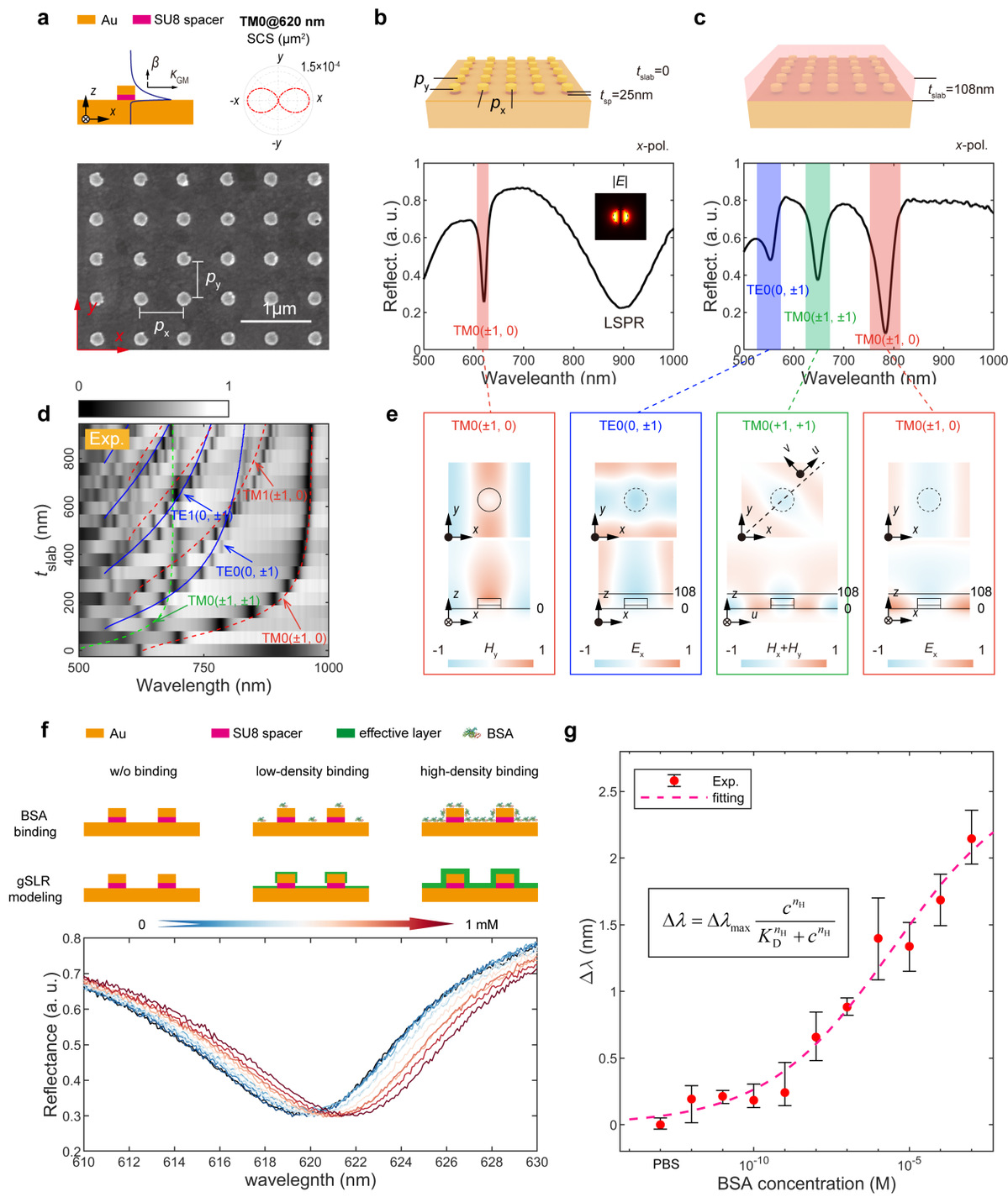 此外,研究团队提出了基于导模晶格共振超表面的生物分子检测方法,通过融合导模晶格共振理论与生化反应动力学,构建了导模晶格共振超表面生物传感器的传感数学模型,并在典型生物分子检测实验中验证了该方法的可行性与可靠性,为新型纳米光学生物传感器的研发提供了重要技术指导与实践参考。